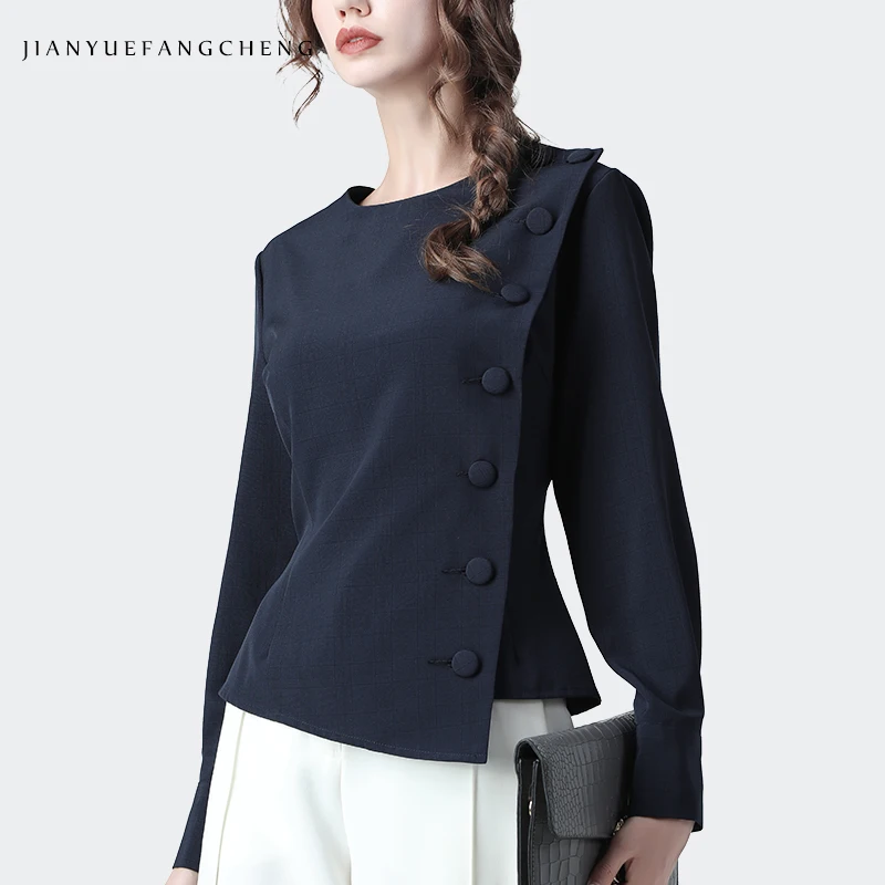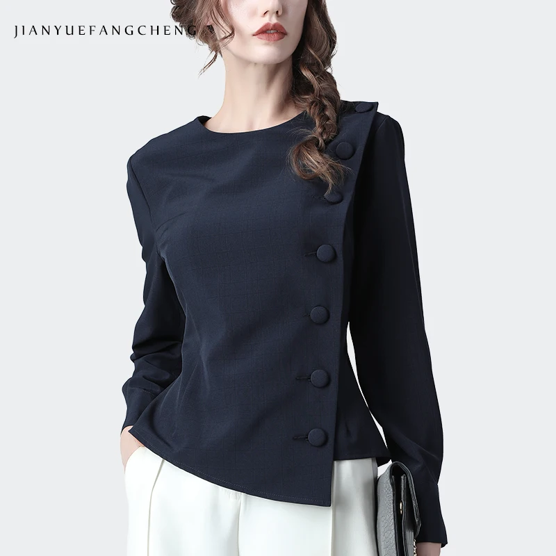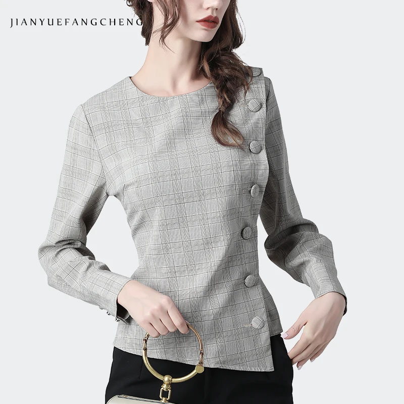 Buy Fashion Button Up Plaid Women Blouse Long Sleeve O-Neck Ladies Autumn Top Elegant Slim Office Ladie