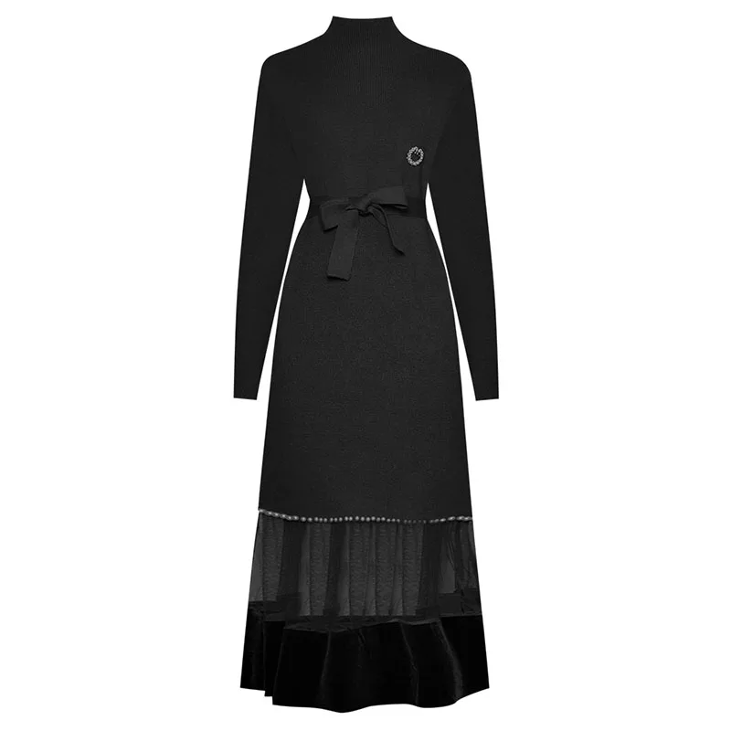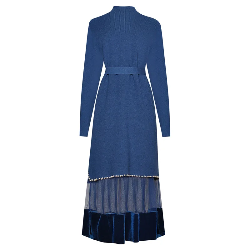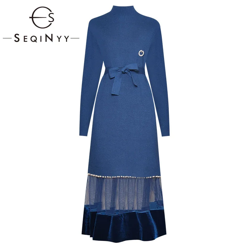 NEW SEQINYY Knitting Dress 2020 Autumn Winter New Fashion Design Long Sleeve Beading Spliced Mesh Midi