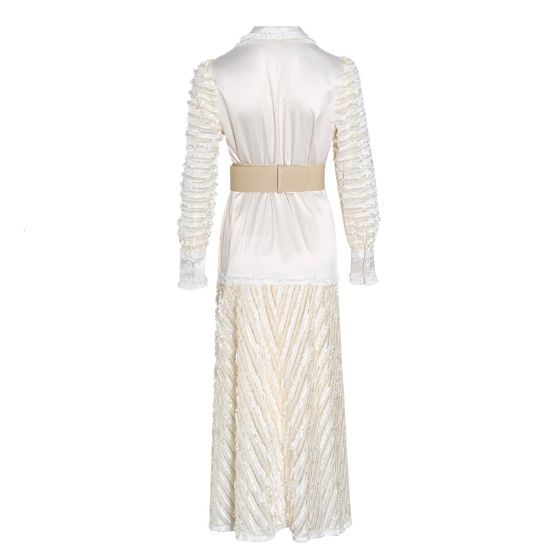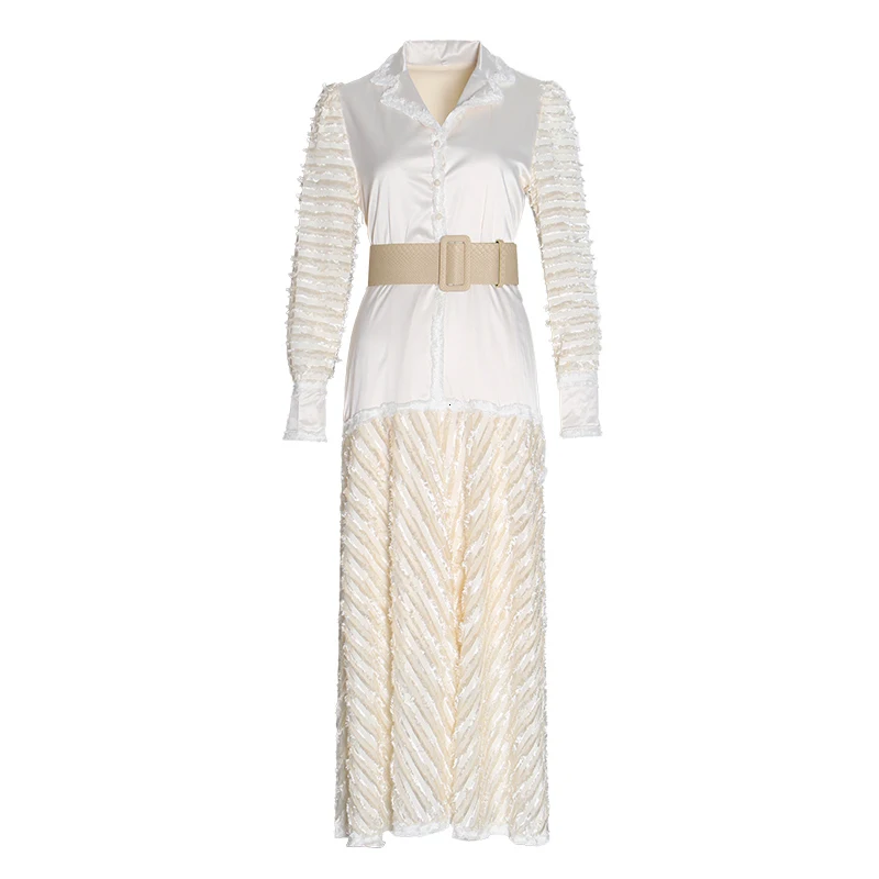 Get TWOTWINSTYLE Bowknot Patchwork Dress For Women Notched Long Sleeve High Waist Lace Up Dresses Femal