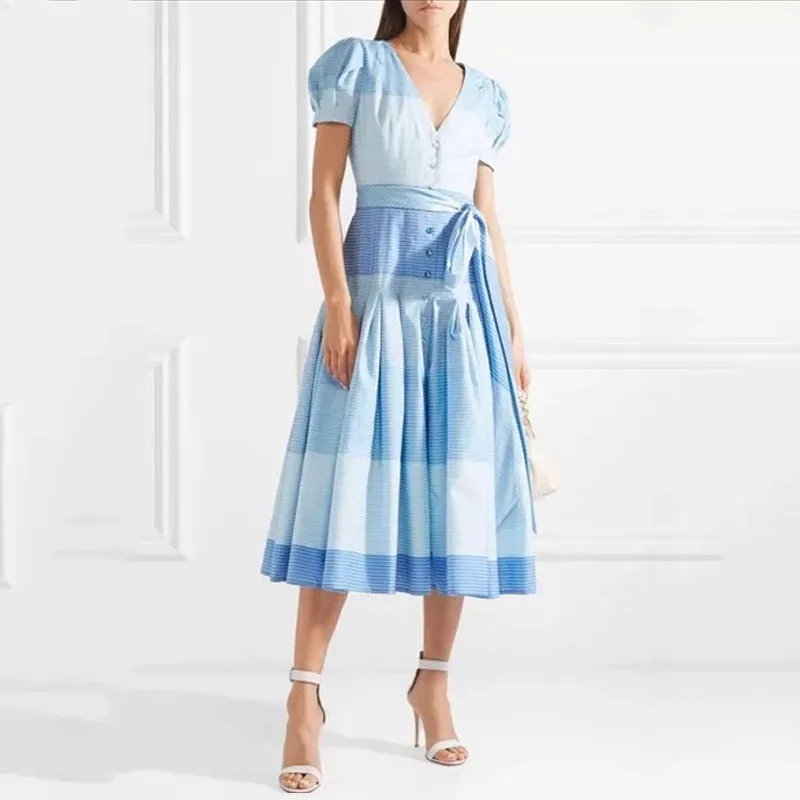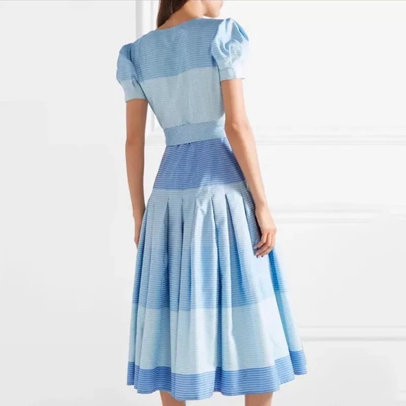 Get TWOTWINSTYLE Striped Dresses For Women V Neck Puff Short Sleeve High Waist Lace Up Midi Dress Femal