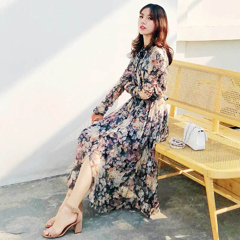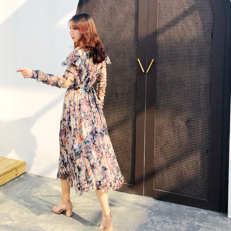 Discount 100% Real Silk Dress Women Two Piece Dress Irregular Printed Lace up Long Sleeves Hem Swing Perspec