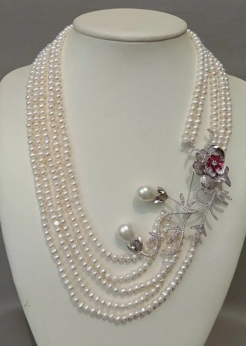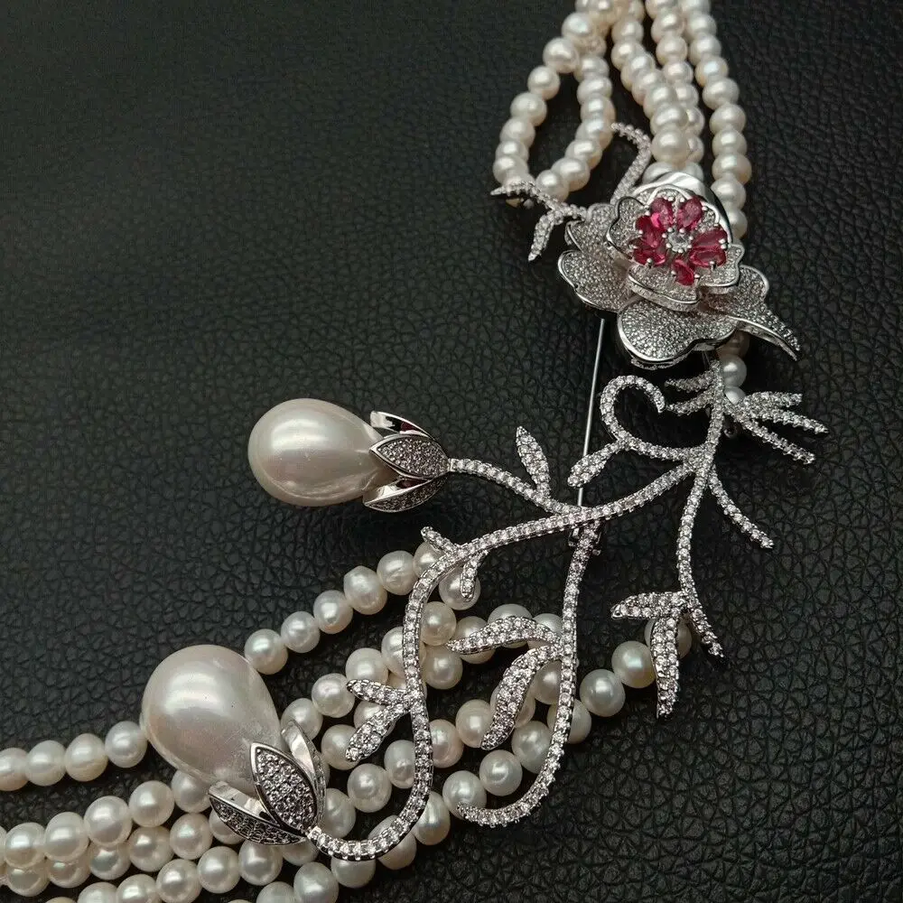 Get 22" 2 Rows Cultured White Pearl Necklace Cz Pave pendant