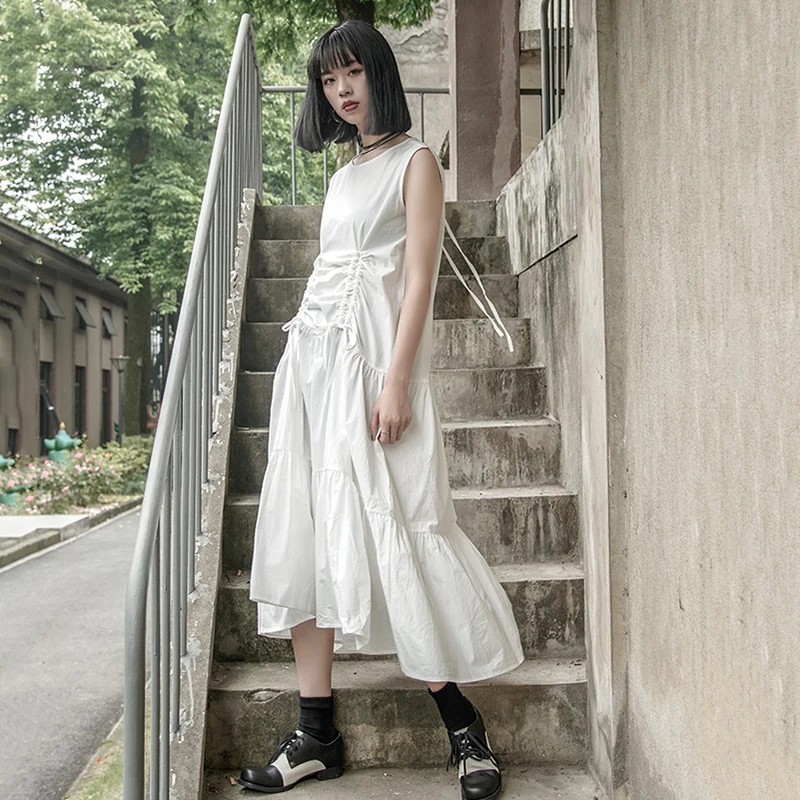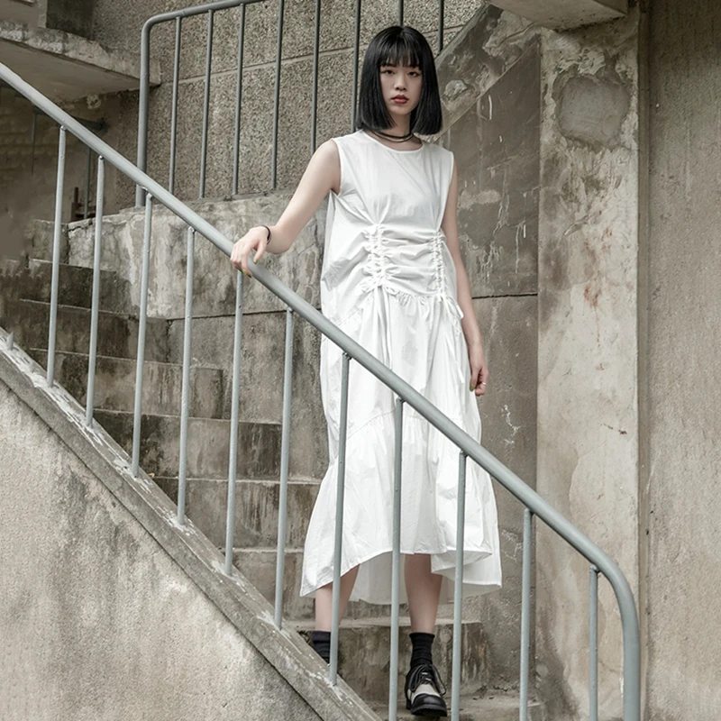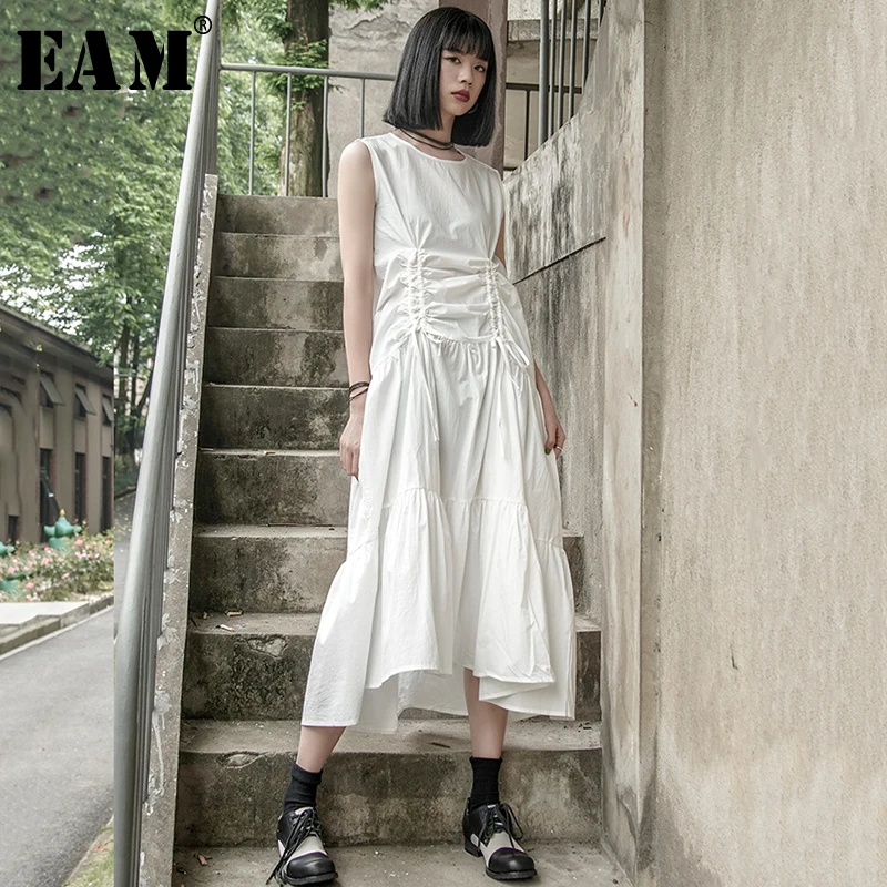 Hot [EAM] 2020 New Spring Summer Round Neck Sleeveless White Drawstring Irregular Loose Temperament Dre