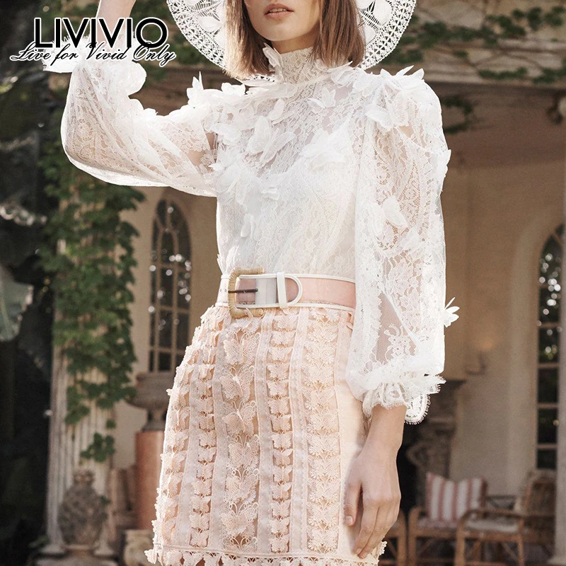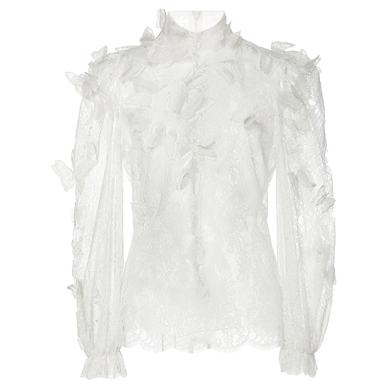Buy [LIVIVIO] Summer Flower Patchwork Shirt For Women Stand Collar Lantern Sleeve Perspective Blouse Fe