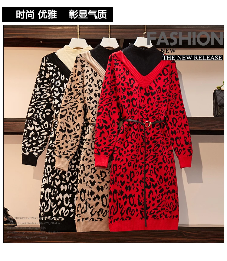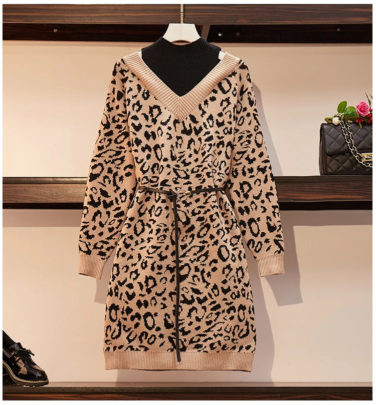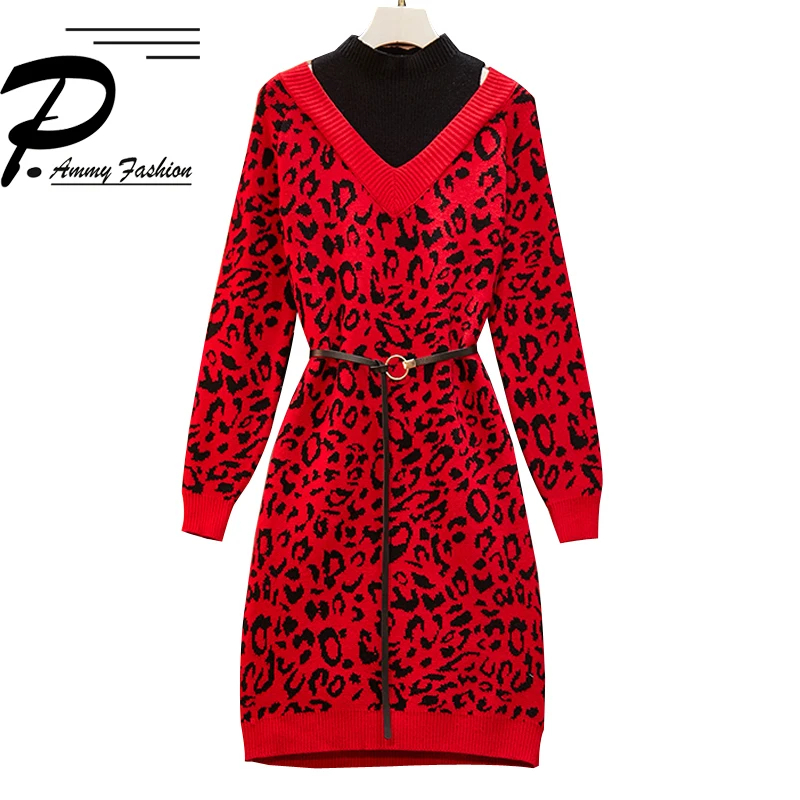 Buy P Ammy 2019 Large size Fake two leopard sweater dress women's autumn and winter Off Shoulder Fashio