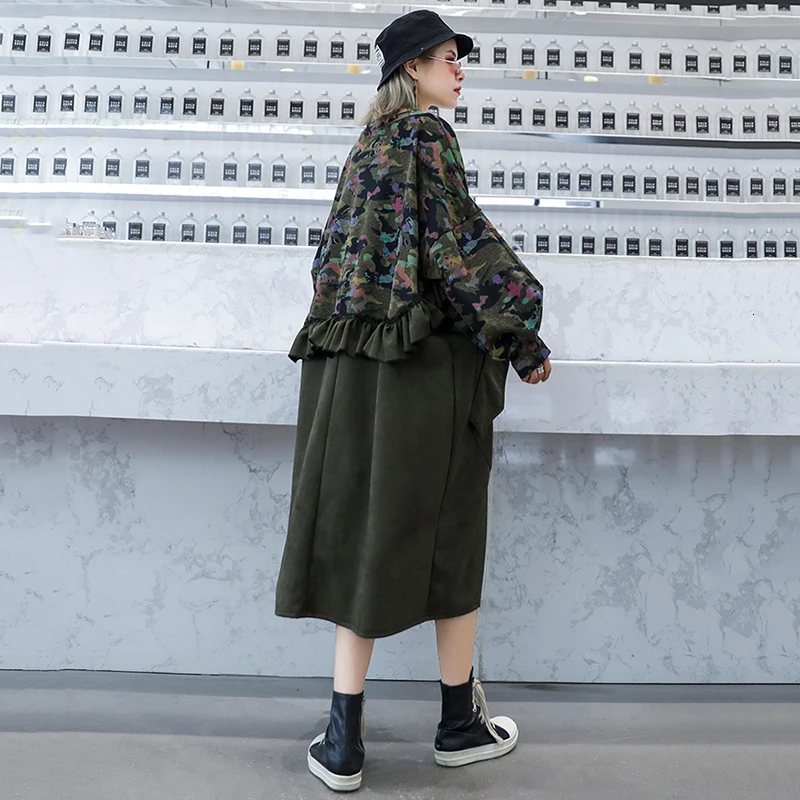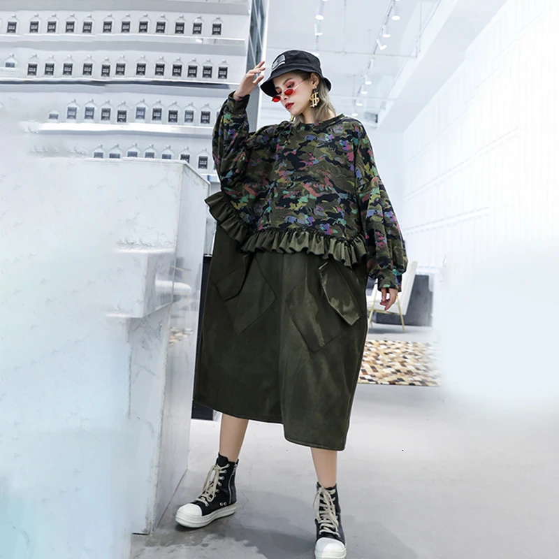NEW [EAM] Women Camouflage Pleated Ruffles Big Size Dress New Round Neck Long Sleeve Loose Fit Fashion