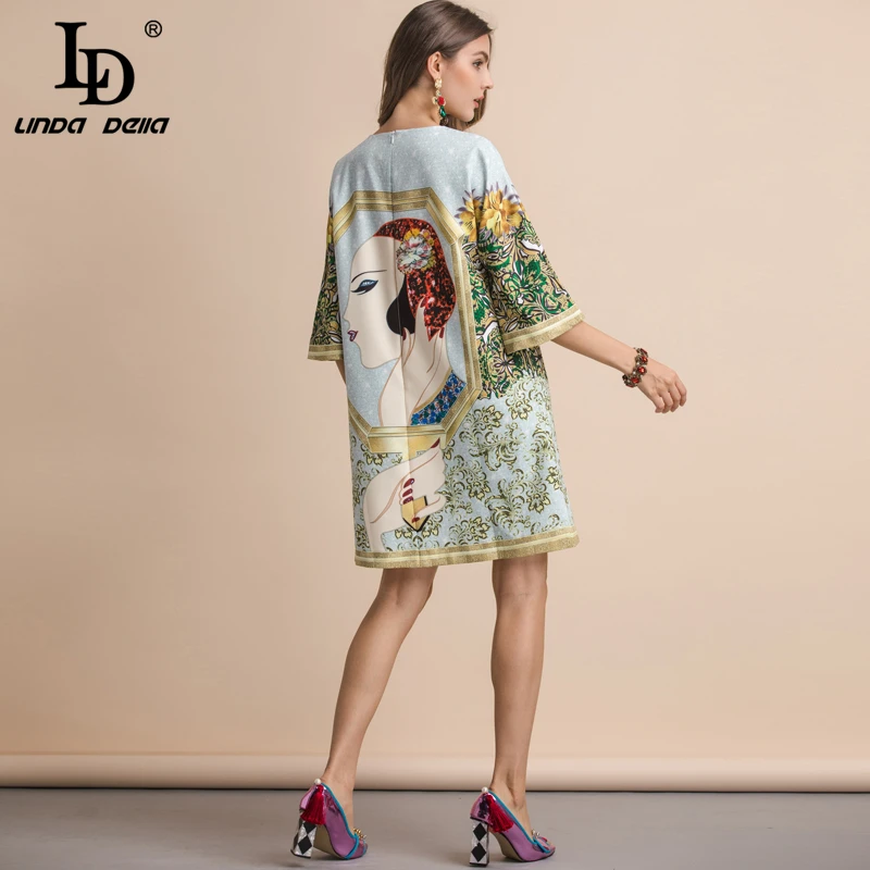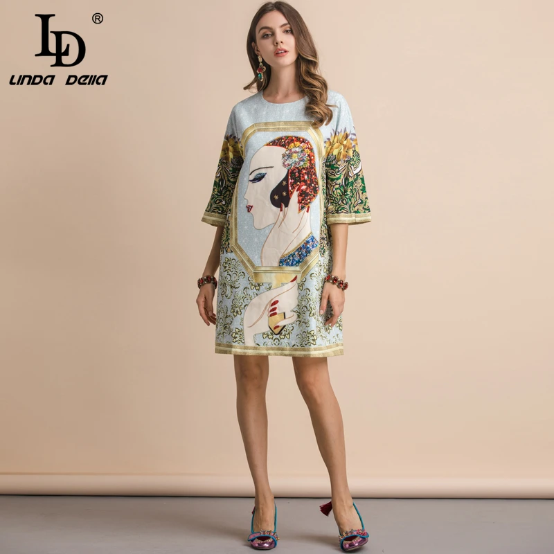 NEW LD LINDA DELLA Fashion Runway Spring Summer Dress Women's Half Sleeve Gorgeous Crystal Character Pr