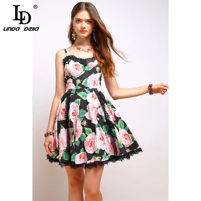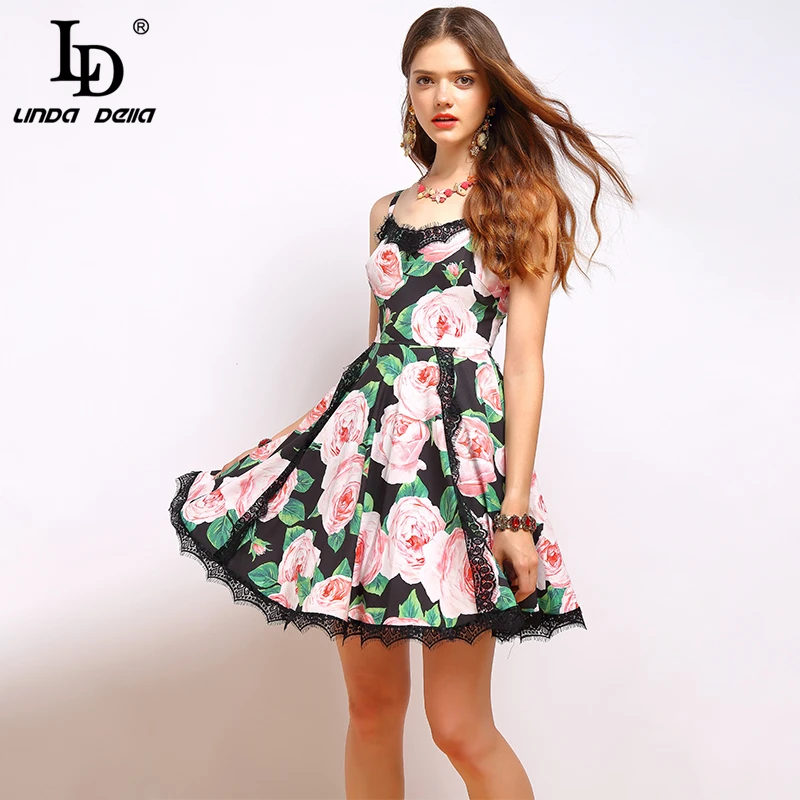 Sale LD LINDA DELLA Fashion Summer Dress Women's V Neck Spaghetti Strap Lace Patchwork Elegant Floral Pr
