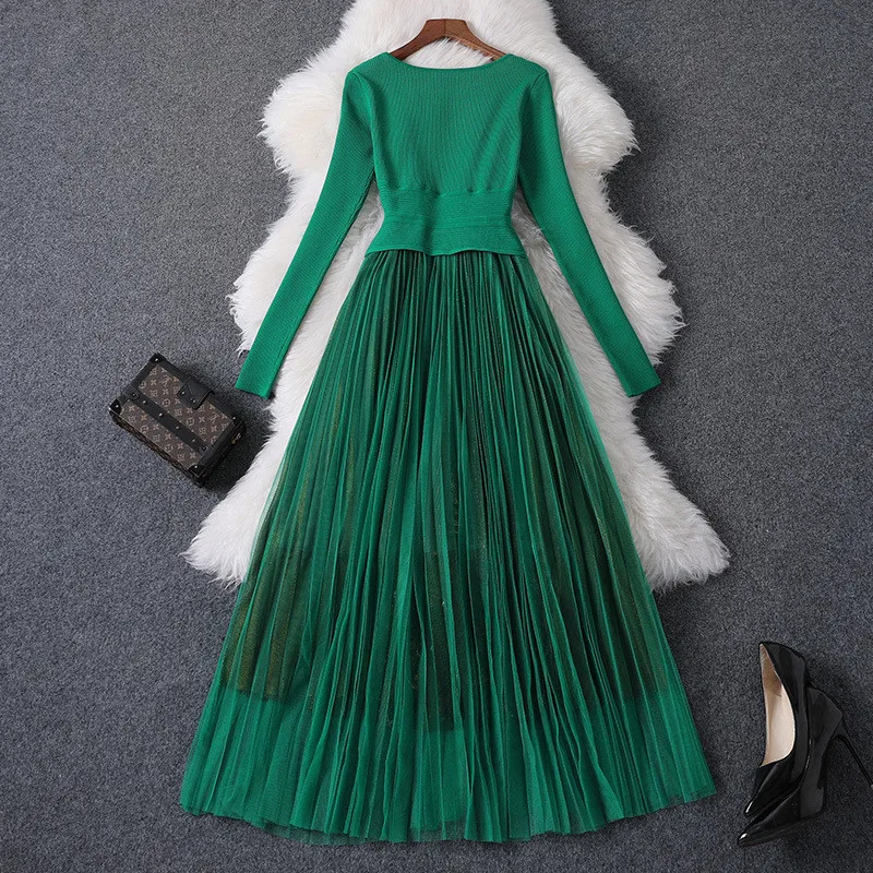 NEW Runway Fashion Designer Autumn Winter Dresses Women Elegant Long Sleeve Knit Sweater Patchwork Empi