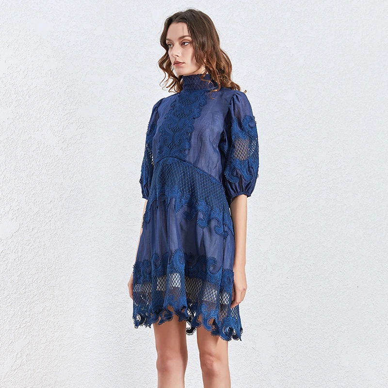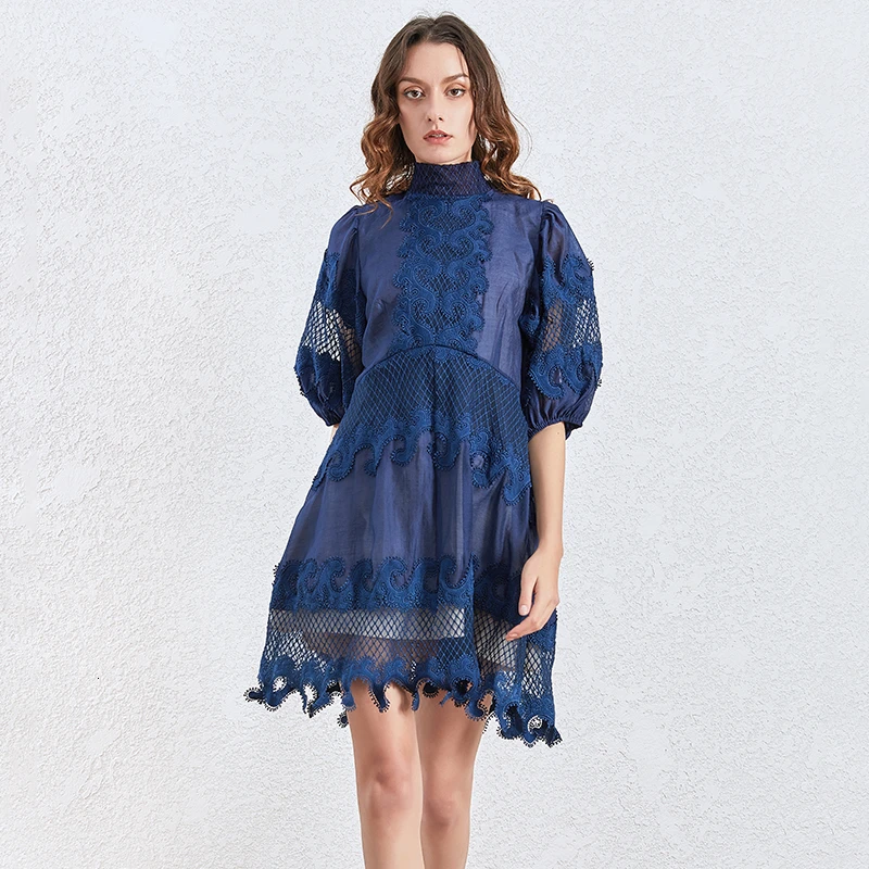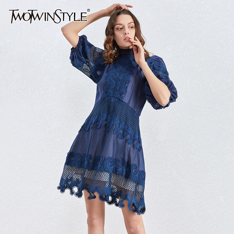 Sale TWOTWINSTYLE Patchwork Hollow Out Plaid Dress Women Turtleneck Lantern Hlaf Sleeve High Waist Dress