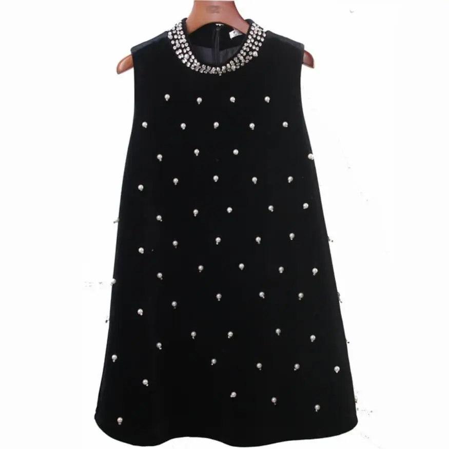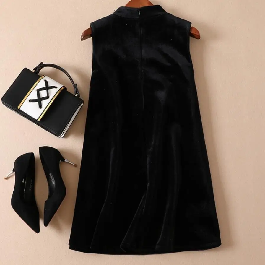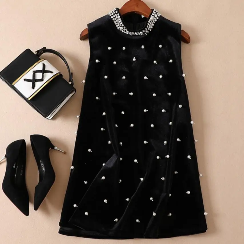 Sale 2019 autumn and winter new fashion women velvet beaded diamond half turtleneck A-line vest dress