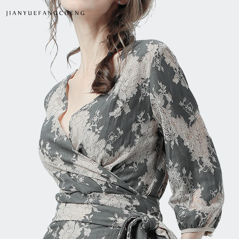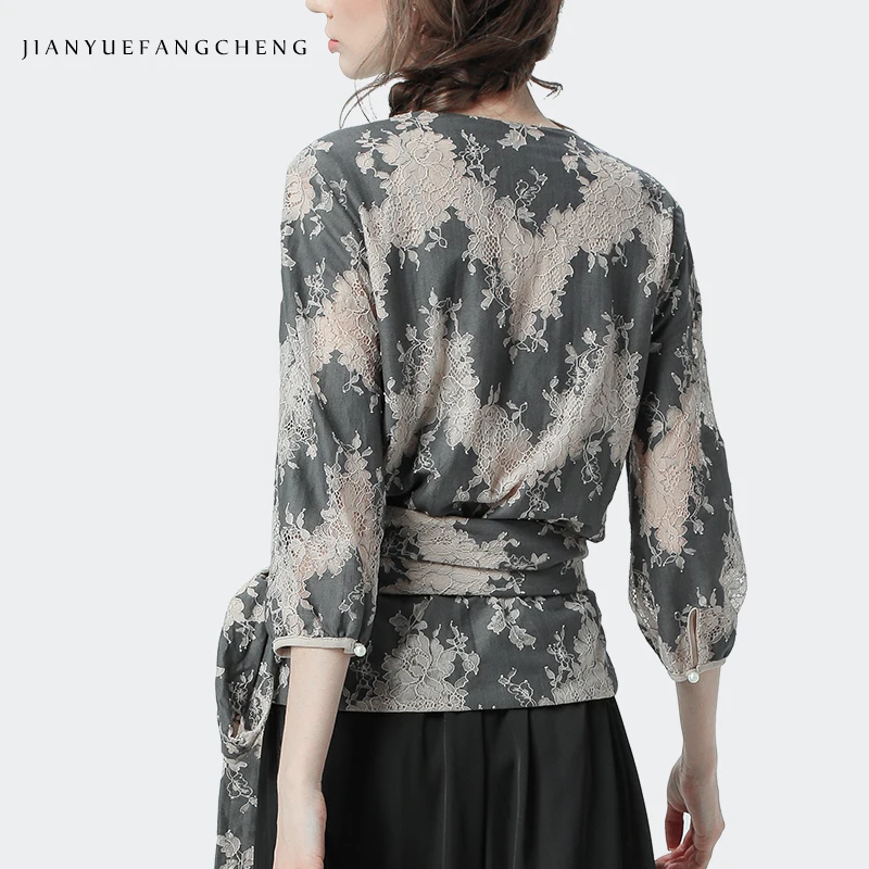 Get Lace shirt Floral Blouse Female Lantern 9/10 Sleeve With Crossed Lace Up Belt Cardigan Summer Tops