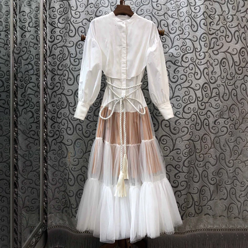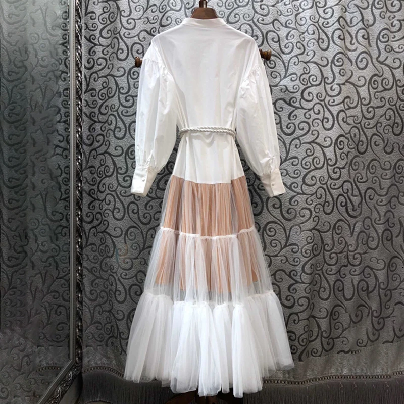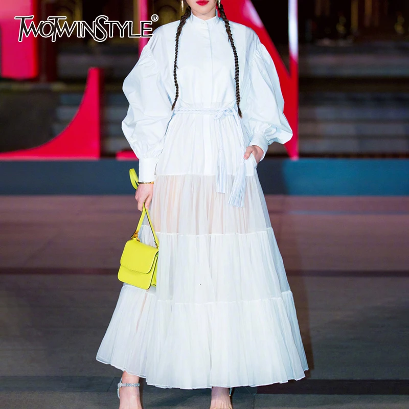 Buy WTOTWINSTYLE Patchwork Mesh Hit Color Dresses Womens Lapel Collar Lantern Long Sleeve High Waist La