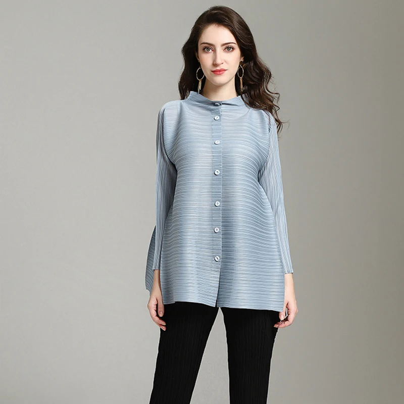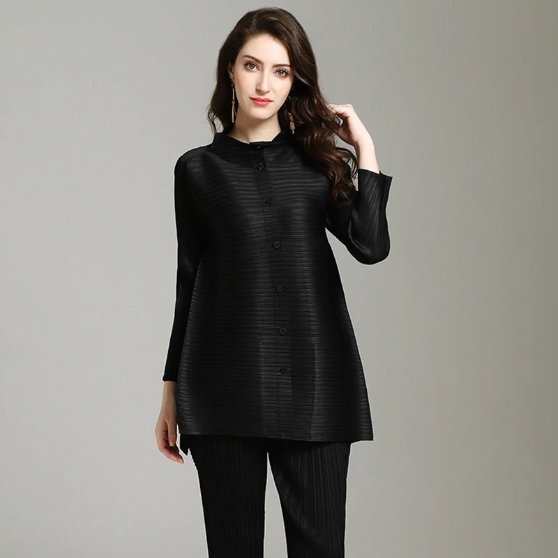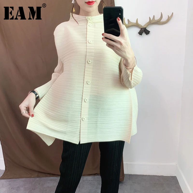 Sale [EAM] Women Black Pleated Big Size Blouse New Stand Collar Three-quarter Sleeve Loose Fit Shirt Fas