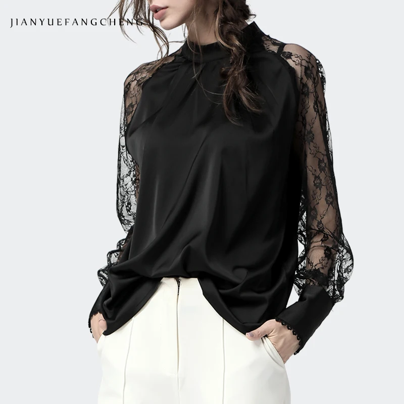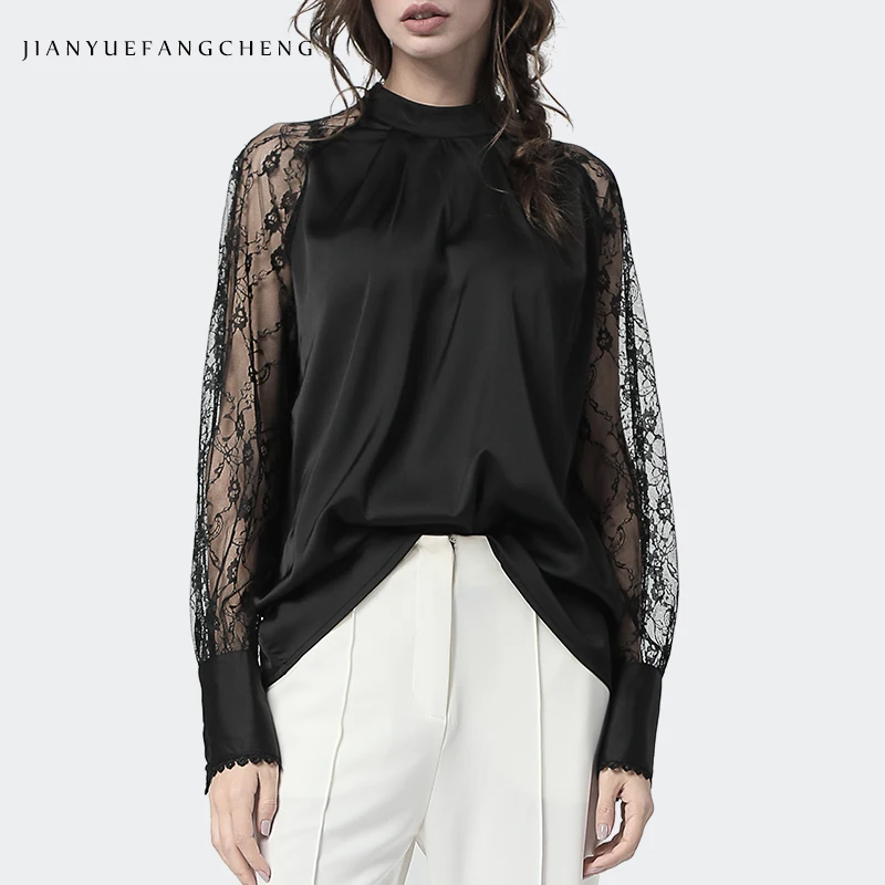 Get Fashion Lace Spliced Women Satin Blouse Black Hollow Out Long Sleeve Stand Collar Tops Elegant Loos
