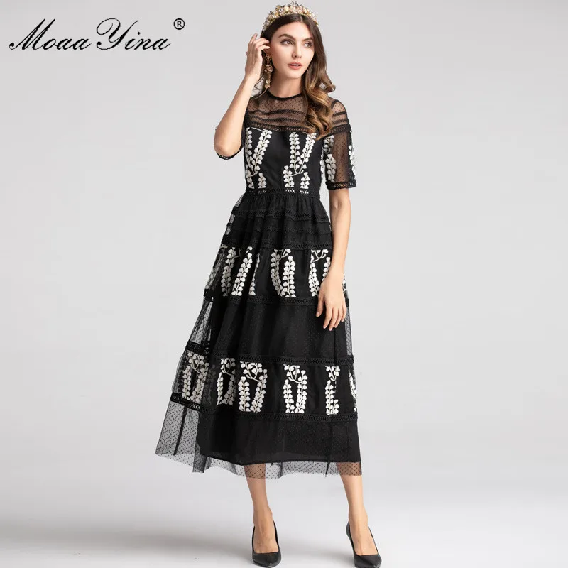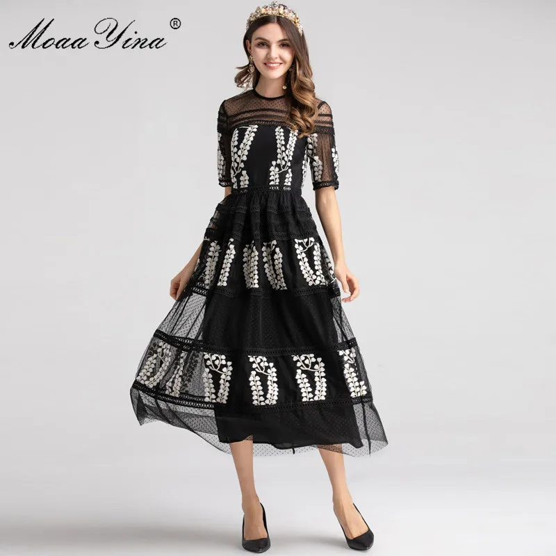 Buy MoaaYina Fashion Designer Runway dress Spring Women Dress Half sleeve Mesh Embroidery Floral Black