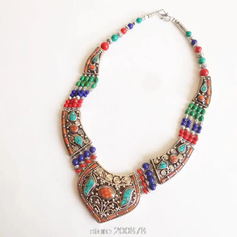 Hot TNL149 Amazing Tibetan Jewelry Nepal brass inlaid Stone coral Lapis Big pendant necklace Multi Stat