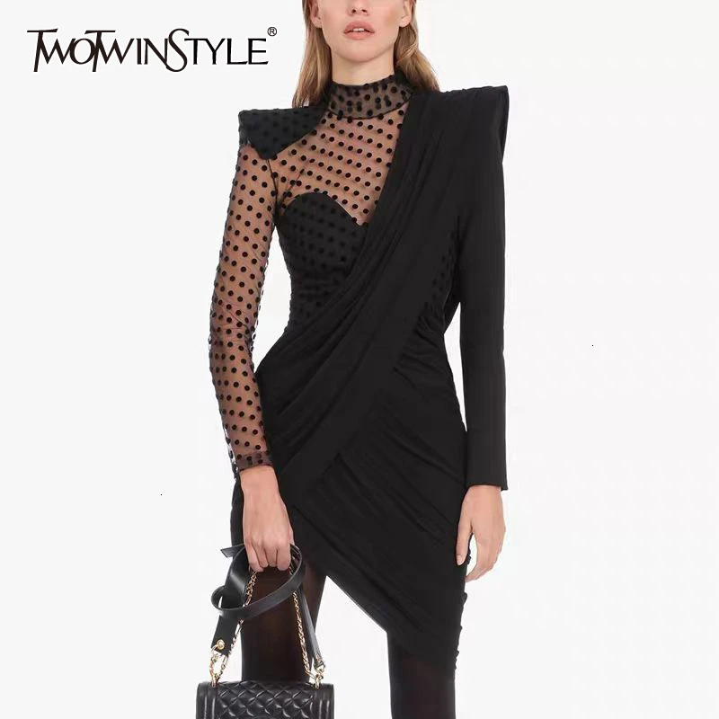Hot TWOTWINSTYLE Elegant Asymmetrical Dot Dresses Female Stand Collar Puff Sleeve High Waist Ruched Mes