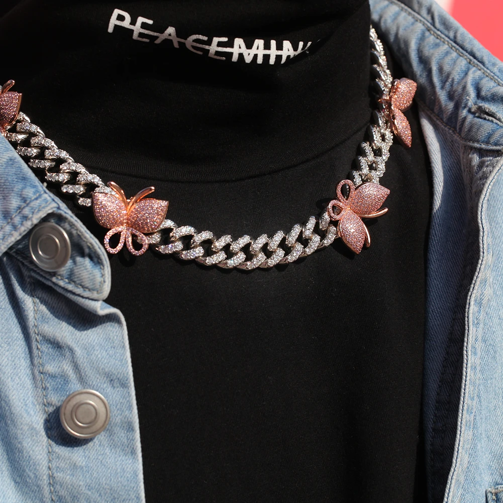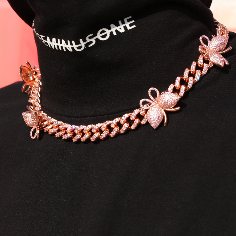Hot Uwin 12mm Cuban Pink Butterfly Necklace Rose Gold Chain CZ Luxury Necklace Bling Bling Hip Hop Jewe