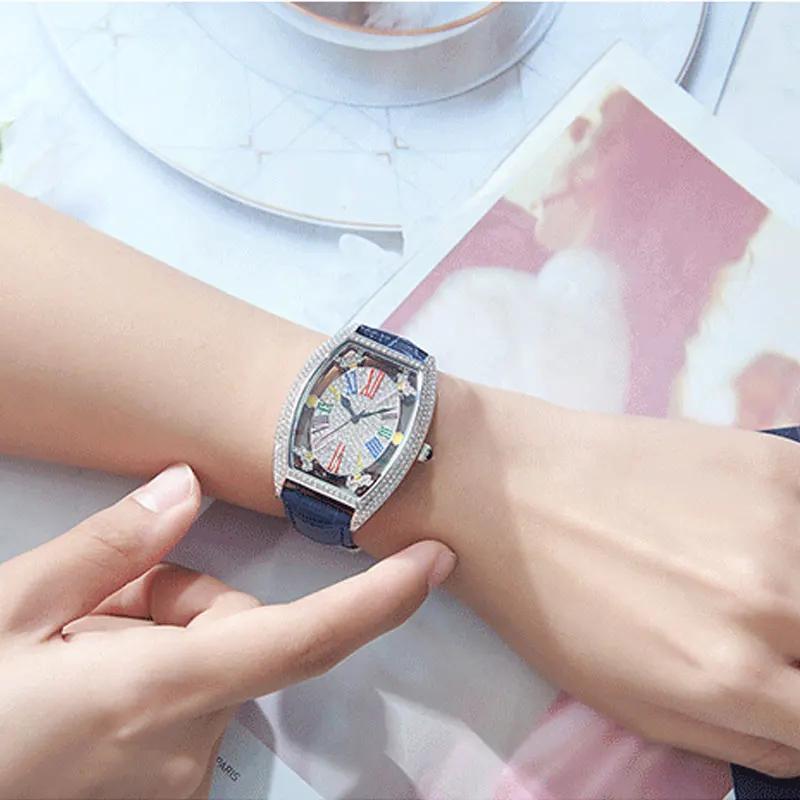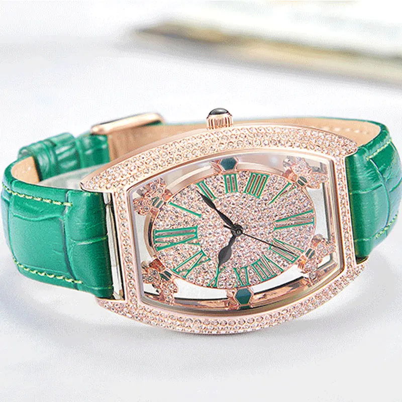 NEW FUYIJIA New Hollow Barrel Type Female Watch Leather Belt Woman Quartz Watch Rose Gold Full Diamond