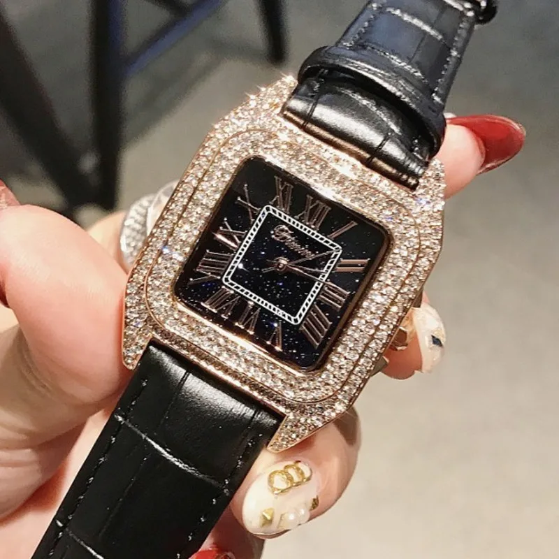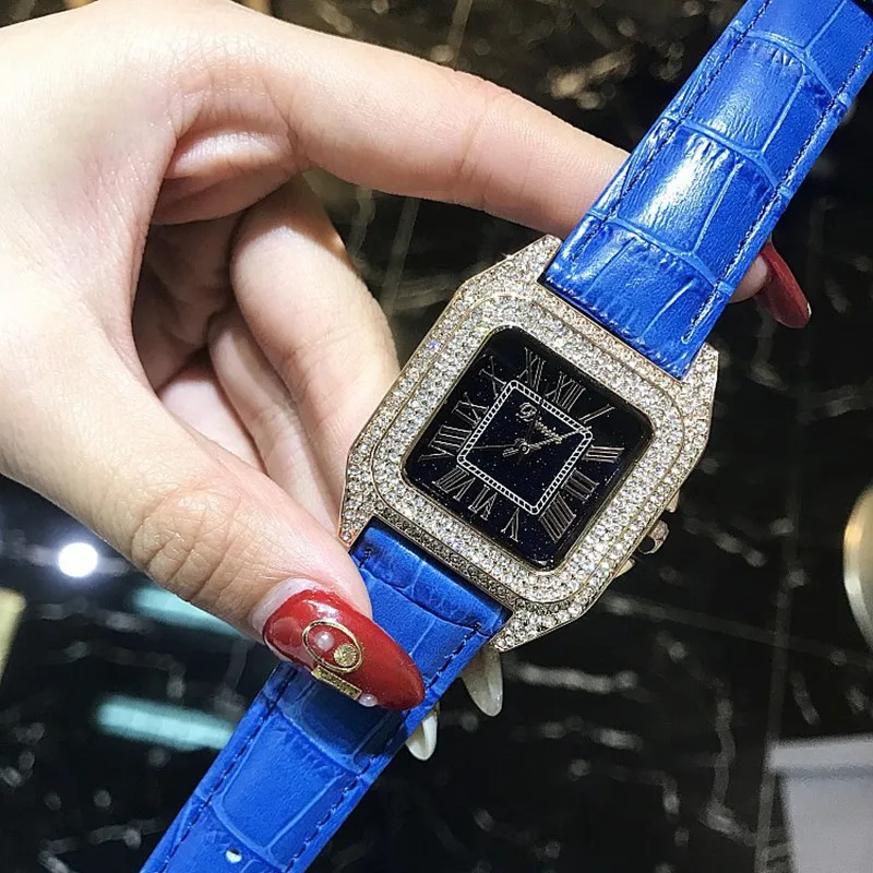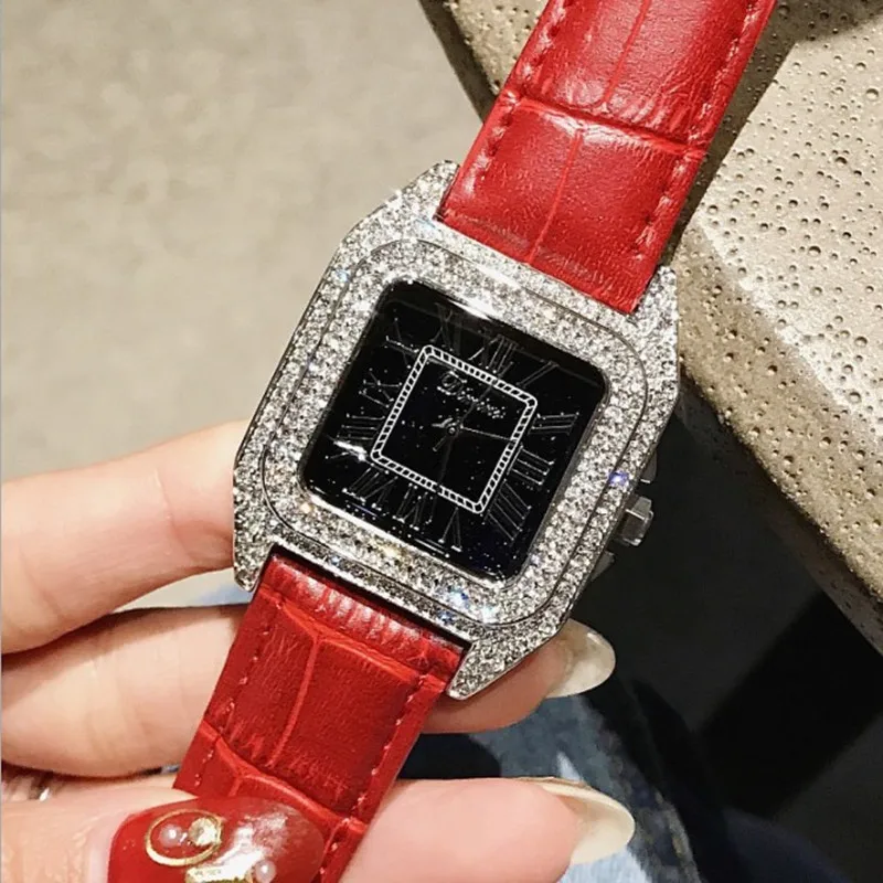 Discount Top Luxury Full Diamond Square Bracelet Watches Women Fashion Leather Strap Rhinestone Quartz Watch